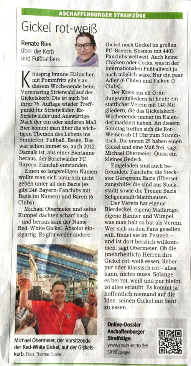 Zunächst sei erwähnt, dass der FC Bayern Fanklub "Red-White Gickel Aschaffenburg-Strietwald e.V. den Gaudi-Cup der SG Strietwald (ausgetragen am 10.7.2016) zum zweiten Mal gewinnen konnte. Wir